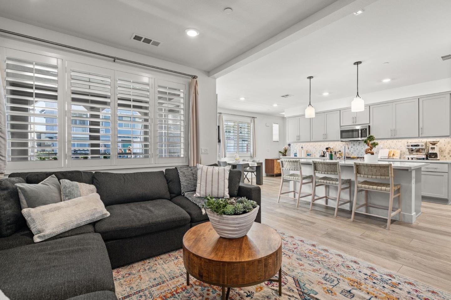 A MUST SEE! Welcome to this stunning former model home in the Bridgeway Community. Crafted with excellence by Lennar in 2022, this home boasts contemporary design elements & thoughtful touches throughout, offering the epitome of comfortable living. The open-concept layout seamlessly integrates the gorgeous living room w/ a wall of designer tiles, dining, & kitchen areas, along w/ a large patio, The gourmet kitchen is a chef's dream, featuring sleek quartz countertops, a large island & breakfast bar, abundant cabinetry, & high-end stainless steel appliances. Retreat to the luxurious oversized primary suite complete with a large walk-in closet, spa-like ensuite bathroom with tub, & his and hers sinks, and access to the balcony for sipping your morning coffee.Two additional well-appointed bedrooms on the same floor. Laundry is conveniently located on the upper bedroom level. The home features a 2-car garage w/ EV charging. Solar panels are installed & fully owned, making the home energy-efficient. Community amenities include a lap pool with a lounge pool section, hot tub with cabanas, amphitheater, gym park, and the 5 acre Le Grand park. clubhouse, which includes a catering kitchen with indoor and outdoor meeting spaces for parties or events, children's play area, dog park, & more!
